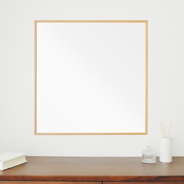 ■細枠正方形ウォールミラー幅60cm (ナチュラル) 天然木 鏡 スリム 高級感 木製 飛散防止加工 壁掛け オシャレ 北欧風 玄関 トイレ 洗面 日