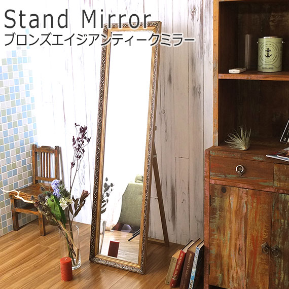 ■ブロンズエイジアンティークミラー (スタンドミラー 姿見 鏡 立て掛けミラー 全身 アンティーク レトロ ブロンズ 高級感 エレガント ガ