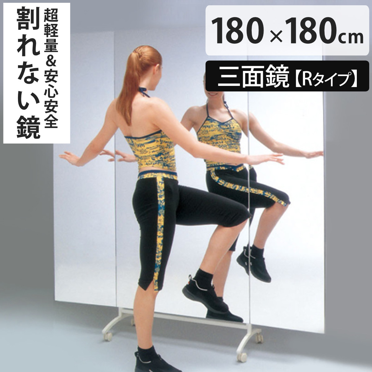 ■割れない鏡 リフェクスミラー キャスター付きスポーツミラー 三面鏡タイプ Rタイプ 姿見 180cm×180cm ( 鏡 全身 三面鏡 スタンドミラー