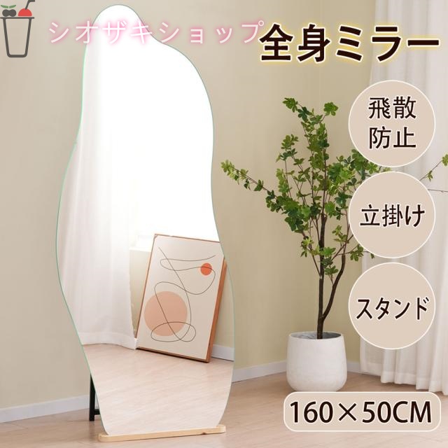 ■全身鏡 姿見鏡 スタンドミラー イレギュラミラー 立てかけ 姿見 鏡 ミラー おしゃれ 大型 飛散防止 木製台あり ノンフレーム 店舗 オフ
