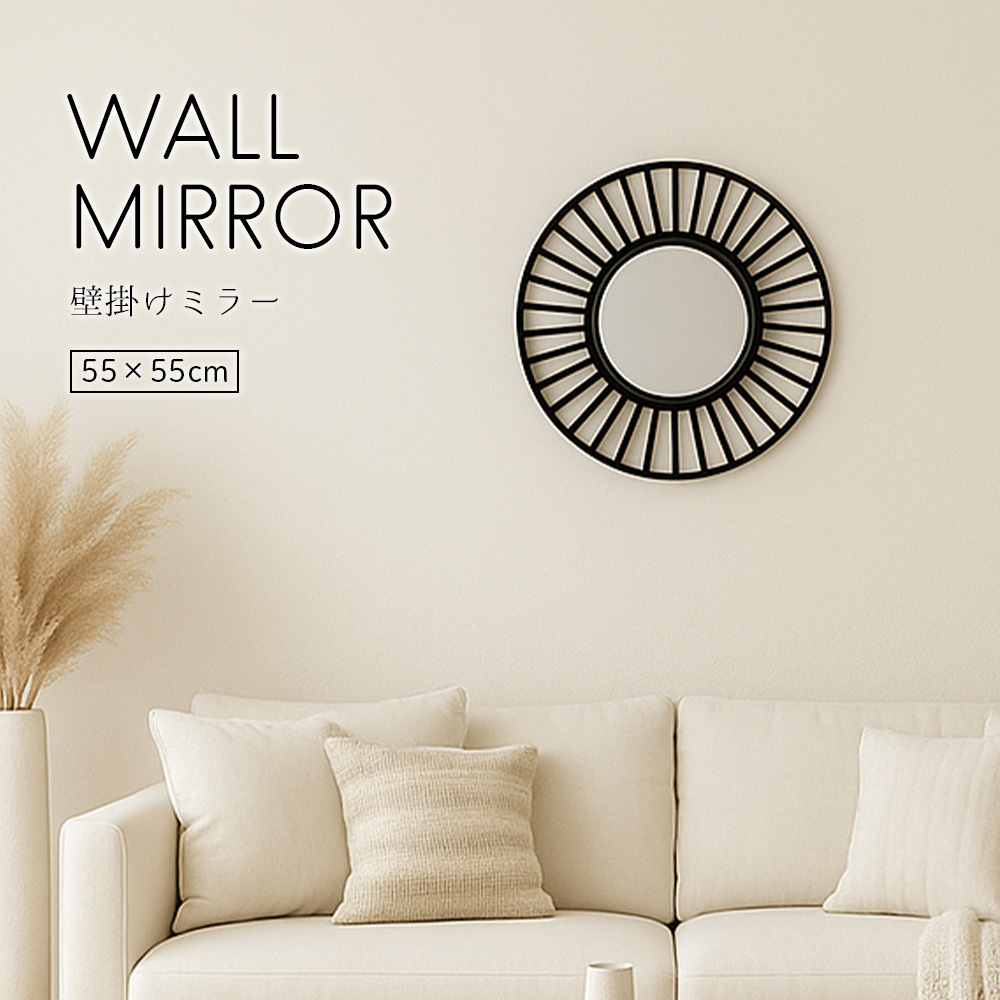 ■壁掛け ミラー 姿見 サークル 丸 壁掛けフックつき 鏡 壁ミラー 直径55cm 鏡27cm 姿見鏡 おしゃれ ブラック 軽量 壁掛けミラー ウォー