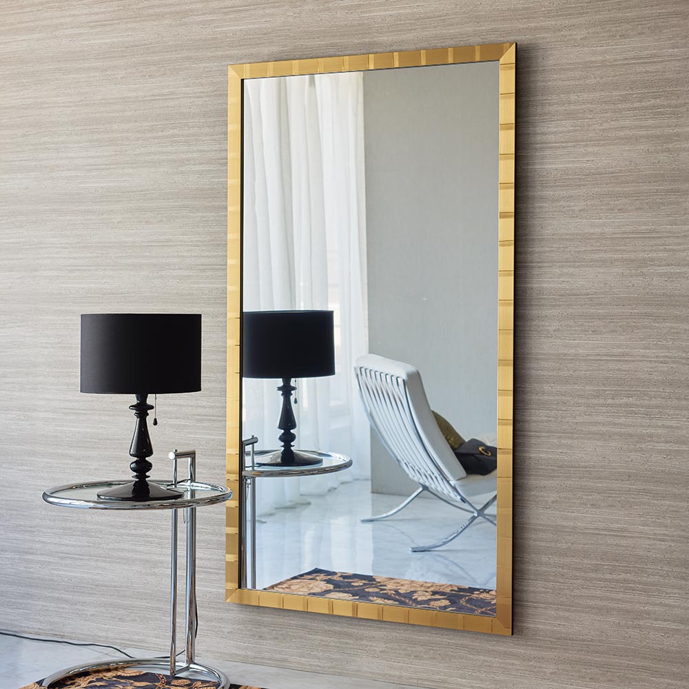 高性能フィルムを採用した明るくクリアな映りの割れないミラーから、お部屋のアクセントとなるモダンフレームが登場。額縁のストライプがさりげなくセンスのある空間を演出。