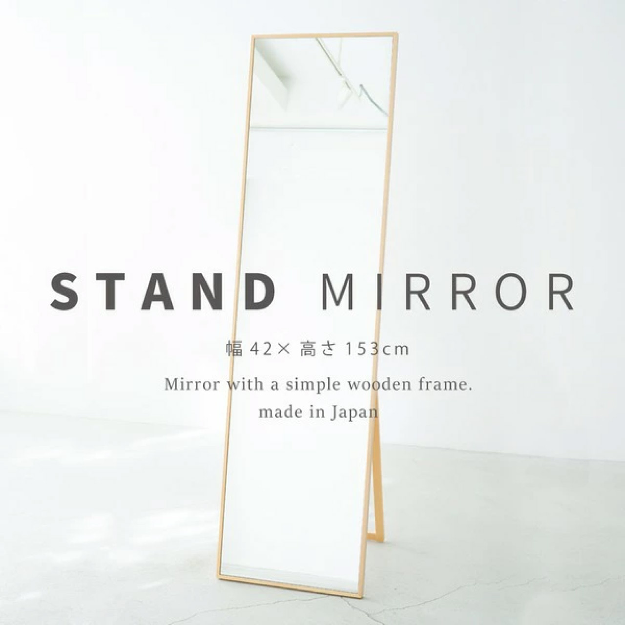 ■細枠スタンドミラー 幅42cm ナチュラル 天然木 北欧風 日本製 ナチュラル 鏡 全身鏡 姿見 高級感 木製 ワイド