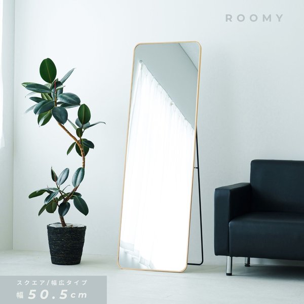■スタンドミラー ルーミー(スクエア)(ゴールド) 幅50cm 鏡 姿見 全身 大型 ワイド 大きい アルミ 折りたたみ ひとり暮らし 一人暮らし