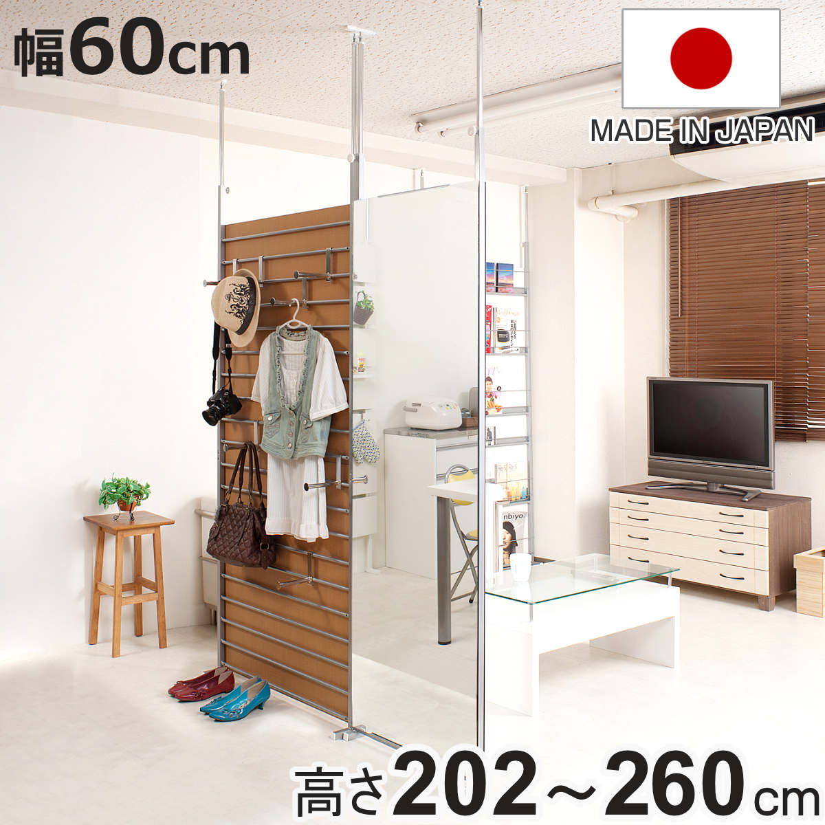 ■突っ張り 間仕切り両面ミラー 幅60cm 日本製 ( 突っ張りパーテーション 両面ミラー ミラー 鏡 両面 間仕切り 壁面収納 つっぱり 姿見 パ