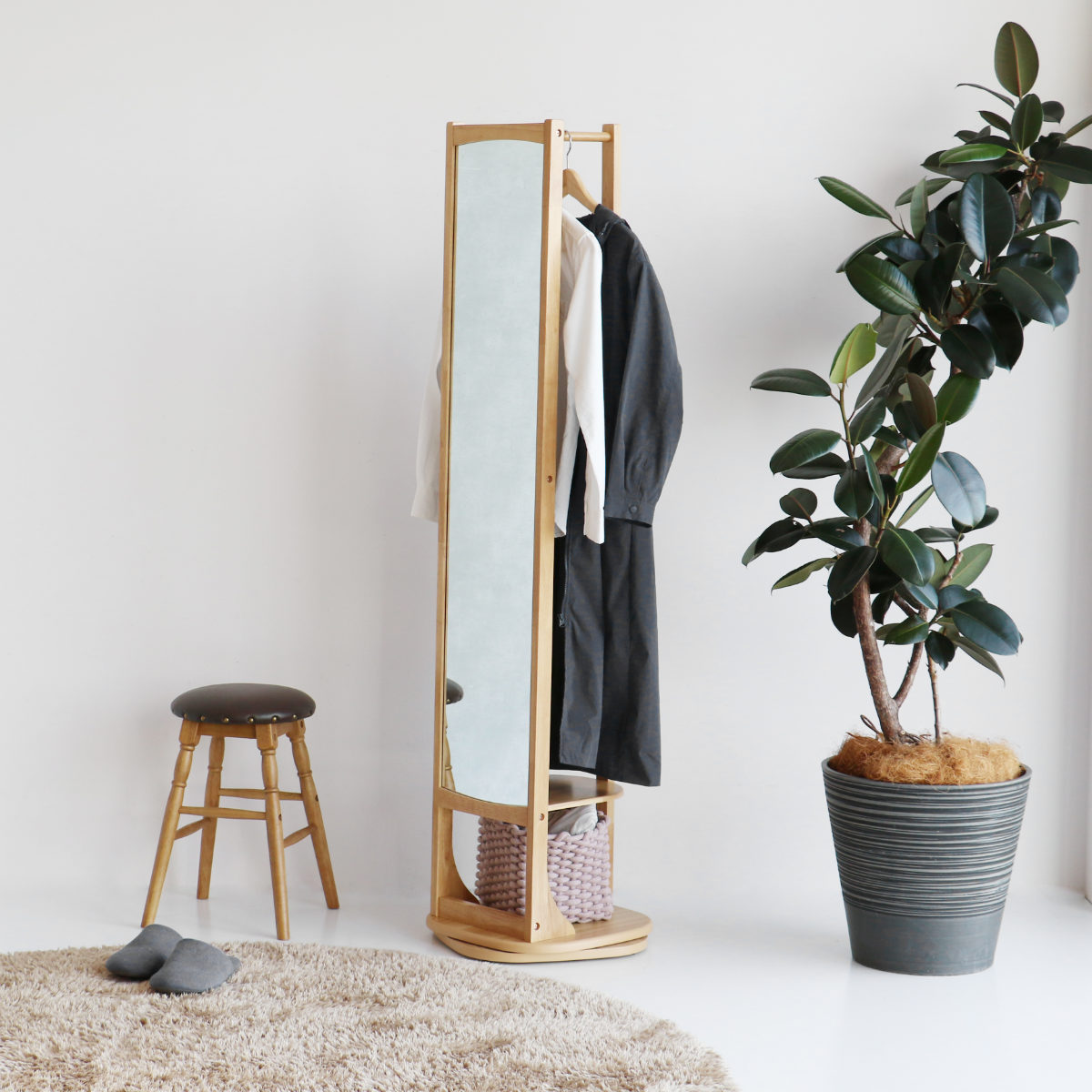 ■スタンドミラー 全身鏡 360度回転式 背面ハンガーラック 棚板付 ( ミラー 鏡 姿見 小物 収納 スリム 省スペース シンプル 木製 北欧 ナ