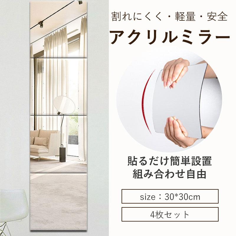 鏡 全身鏡 姿見 ミラー 貼る鏡 ウォールミラー 30*30cm 4枚セット 壁掛 風呂 浴室 軽量 省スペース 割れにくい 飛散防止 玄関 リビング
