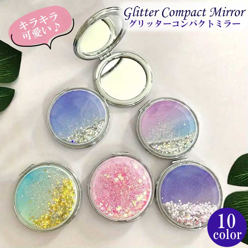 送料無料 キラキラとラメが流れる ミラー 化粧ポーチに入れやすい グリッターを見て癒される♪ 化粧直し かわいい ラメ入り 携帯ミラー 身だしなみチェック メイク ポケットサイズ