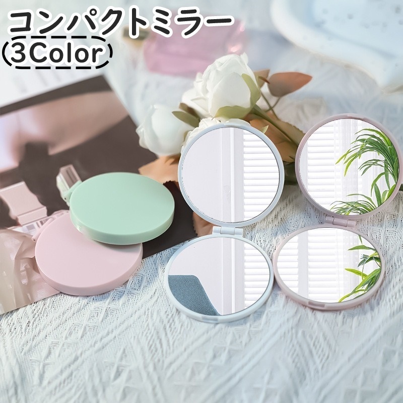 ■コンパクトミラー 手鏡 ハンドミラー 両面タイプ 二面 丸型 ラウンド型 折りたたみ 携帯用 ミニ 持ち歩き便利 化粧直し メイ
