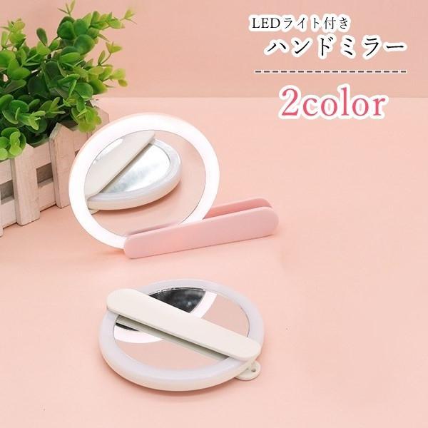 ハンドミラー 手鏡 LEDライト付き レディース 女性 ファッション雑貨 持ち手付き 折り畳み式 リチウム 充電式 無地 ピンク ホワイト シンプル