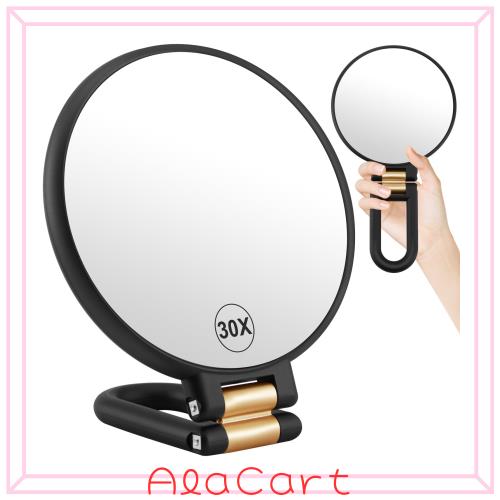 ■LunarCorky 手鏡 拡大鏡 30倍と等倍両面ハンドル付き化粧鏡 持ち運び便利 卓上ミラー 旅行用 折りたたみ式ハンドミラー (色: ブラック,