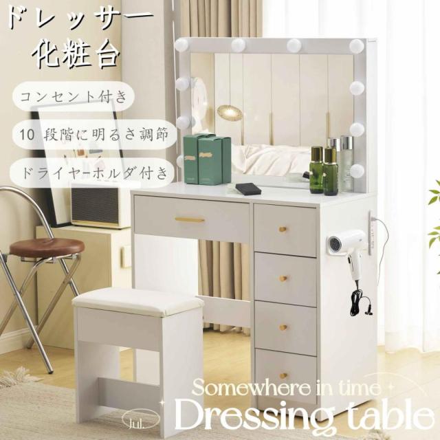 「クーポン配布中」ドレッサー 化粧台 テーブル 鏡台 ライト付き 3色LED ドライヤーホルダー コンセント付き 女優ミラー 引き出し 収納 椅子 セット サイド収納 メイク台 シンプル 大容量 可愛い 一人暮らし クリスマス プレゼント