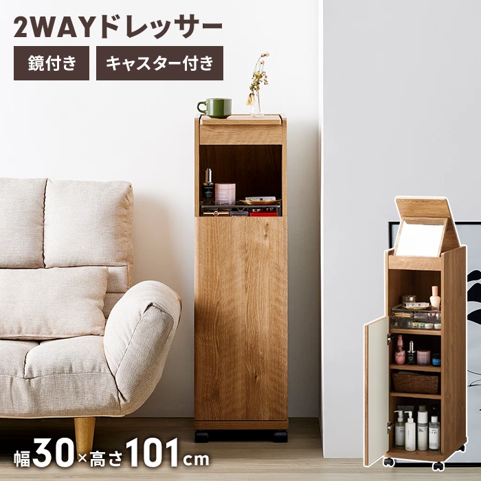 幅30cmで場所をとらない大容量のキャスター付ドレッサー。ソファに座りくつろぎながらでも、立ってでもメイクが出来る便利デザイン。ミラーは7段階の角度調整が出来ることにより座っても・立ってもしっかりとお顔を映し快適メイク。ごちゃごちゃしたメイク道具も大容量で収納可能。普段良く使う物はオープン収納部へ、余り使わない物は隠せる扉内へまとめて収納出来ます。背面は雑誌やIpadの収納にも便利なオープンスペースを設定してソファサイドでも設置出来ます。キーワード: ドレッサー コンパクト おしゃれ かわいい ワゴン コスメワゴン キャスター付き コスメボックス 鏡台 一面ドレッサー メイク台 化粧台 メイクボックス スリム 北欧 シンプル 隙間 ナチュラル 鏡付き ミラー ドレッサーワゴン メイクボックス メイク台 スリム ミラー付 ミニドレッサー メイク収納 コスメ収納 収納家具 コンパクト シンプル 隠す収納 リビング 寝室 ワンルーム