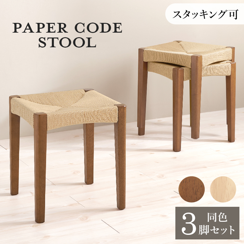 ■スツール 3脚セット 小椅子 CODE 34×奥行34×高さ45cm スタッキング可能 ペーパーコード ナチュラル ブラウン 北欧スタイル ドレッサー