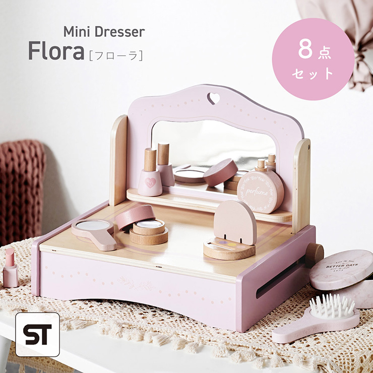 ■【完成品/STマーク付き】ままごと ドレッサー おもちゃセット 8点セット ミニドレッサー Flora(フローラ) おままごとセット 化粧台 おし