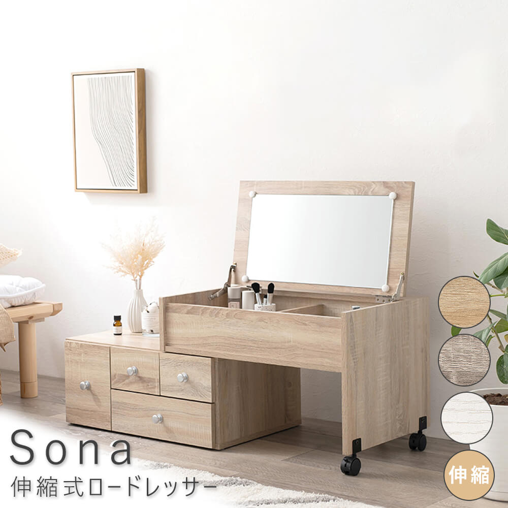 ■Sona(ソーナ) 伸縮式ロードレッサー ドレッサー テーブル デスク 伸縮式ロ−ドレッサー コンセント付き 伸縮式 鏡台 机
