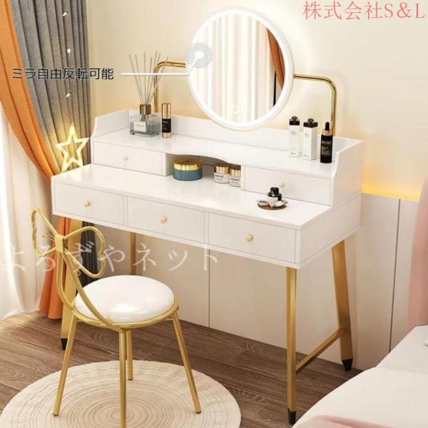 ■LEDライト付き コスメボックス ドレッサー 化粧台 ミラー付き 丸型ミラー 女優ライト 机 スツール付き デスク 幅75cm シンプル 収納ボッ