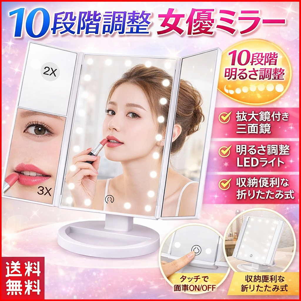 ■女優ミラー 卓上 ライト 三面鏡 ドレッサー 洗面台 女優ライト 照明 電球 zoom スマホ 卓上ミラー 大きい おしゃれ LED 折りたたみ 拡大