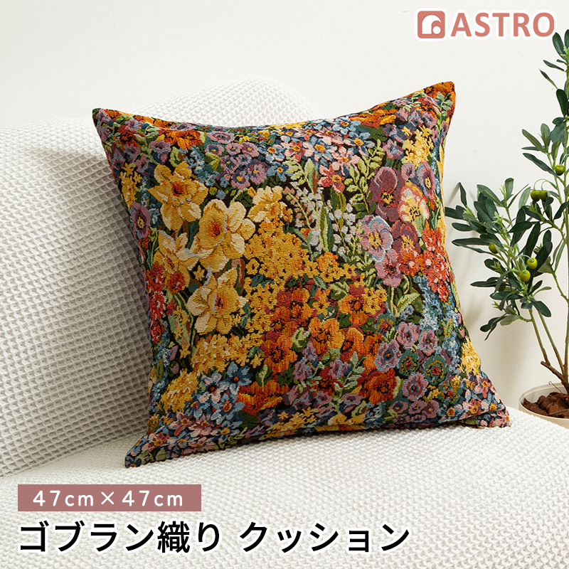 商品名:ゴブランクッションサイズ:クッション/約幅45×奥行45×高さ15cm、クッションカバー/約45×45cm柄:花柄内容:各1個(クッション+クッションカバー)材質:クッション/[側生地]ポリエステル [充填物]ポリエステル、クッションカバー/ポリエステル80%・綿12%・レーヨン5%・ナイロン2%・その他1%【特長】●45×45cmのクッションと、厚手のゴブラン織り生地を使用したクッションカバーのセット。アンティーク調の深みのある色合いに繊細な花柄。●ソファや椅子、ベッドの上など、置いているだけでお部屋が上品で華やかに。背もたれにしたり、腰当てやお膝の上、お昼寝時の枕代わりにも。●カバーも中身も汚れてしまったら洗えるので、清潔に保てる。ダイニングでのご使用や、お子様やペットのいるお部屋でも気にせず置きやすい。●軽いのにしっかりと弾力のあるポリエステルのわたで、ふかふかなのに重さを感じないクッション。カバーはなめらかな手触りで型崩れしにくい。