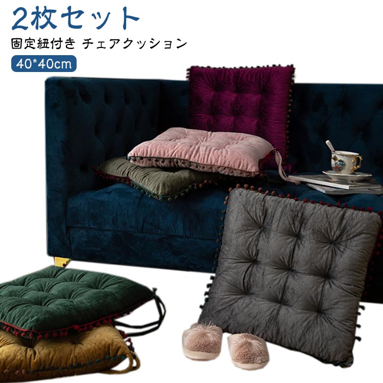 ■座布団 紐付き チェアクッション 40*40cm 2枚セット クッション タッセル 四角 ポンポン付き ダイニングチェア 北欧 イス 椅子 座布団 正