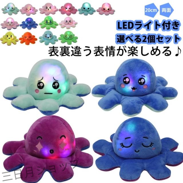 LEDライト付き たこ リバーシブル 20cm タコのぬいぐるみ ぬいぐるみ 両面 ストレス解消 面白い 裏返し 光る キラキラ 人形 おもちゃ 誕生日 表情変化楽しめる 知育玩具 減圧 マスコット ふわふわ 出産祝い 選べる2個セット
