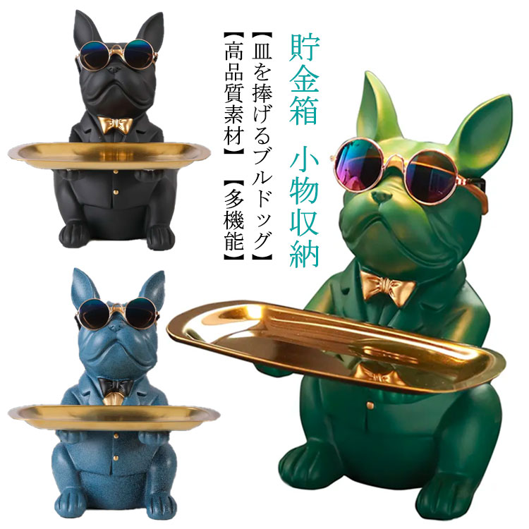 ■皿を捧げる犬さん 置物 キー収納トレイ 貯金箱 鍵置き 3in1 玄関 小銭ボックス 小物収納 飾り インテリア 樹脂製 ステンレス鋼の皿 眼鏡/