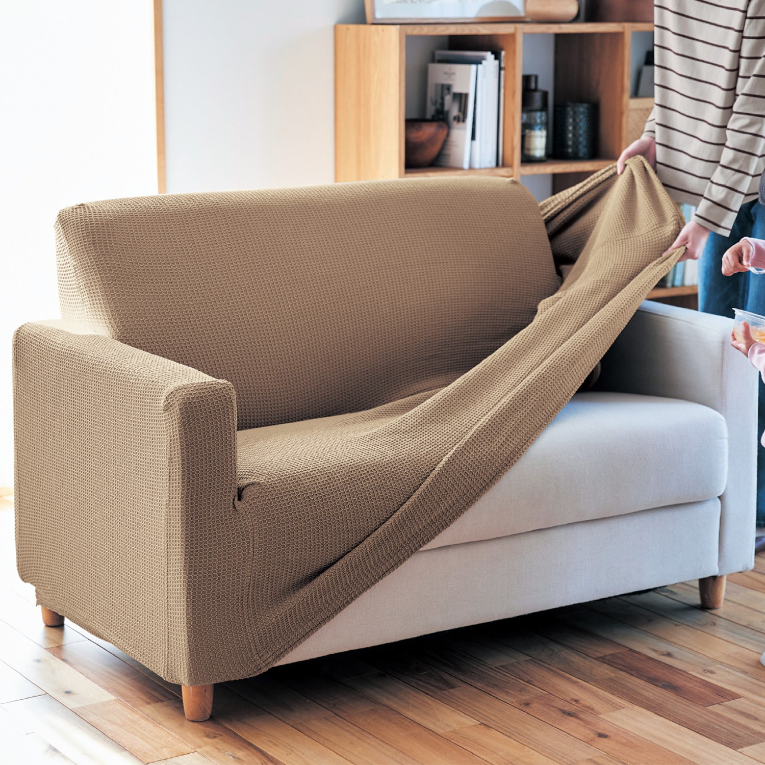 本体と背面・座面を分けたソファー用・分割タイプシャリッと心地いいリネン混素材を、ぽこぽこと凹凸のある編み地にした夏仕立てに肌にあたる面積が少ない分、汗ばんでいてもぺったりと貼りつかず、手ざわりもさらっとしていますタテヨコによく伸びて、パーツごとなのでひとりでも簡単に掛け替えられます汚れたパーツだけ洗濯できるのも便利水をこぼしてもさっと拭きとれてお手入れしやすい、撥水加工済み