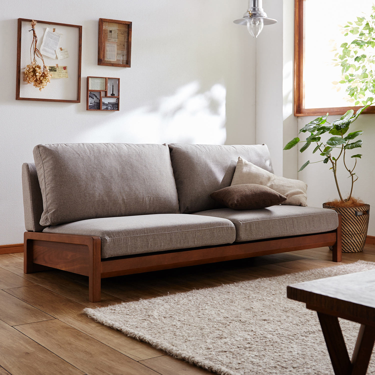 ソファーがほしいけど足を伸ばしたい...そんな人にもうれしいローソファーですナチュラルさを楽しめる天然木フレームは丸みをつけ優しい印象に仕上げましたやや斜めに落ちたサイドデザインで横から見てもおしゃれあたたかみのあるファブリック生地はドライクリーニングできるカバーリング仕様お子様がいるご家庭にもおすすめですしっかりとした座面で立ち座りラクチンクッション性のある背もたれで座り心地GOOD落ち着きのあるカラーは4色、フレームは2色の8タイプ展開