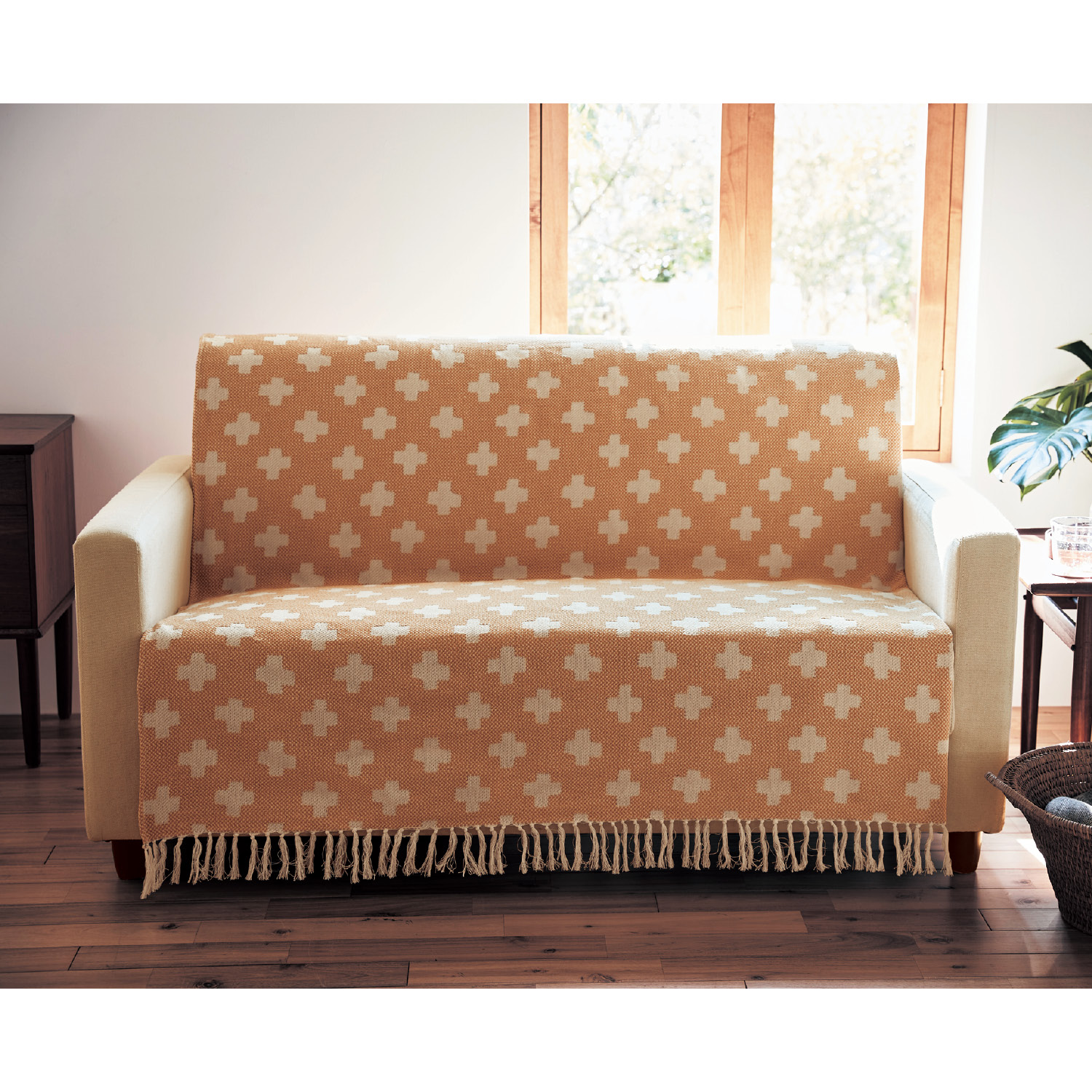 ーデザイン・スタイリングー・ジャカード織で表現した北欧調のモチーフと揺れるフリンジが軽やか・ナチュラルでどんなインテリアにも合わせやすいー素材・機能ー・ざっくりとした質感が魅力のインド綿を使用・ソファーにサッと掛けるだけで印象チェンジ・1枚布なのでお手入れもしやすい