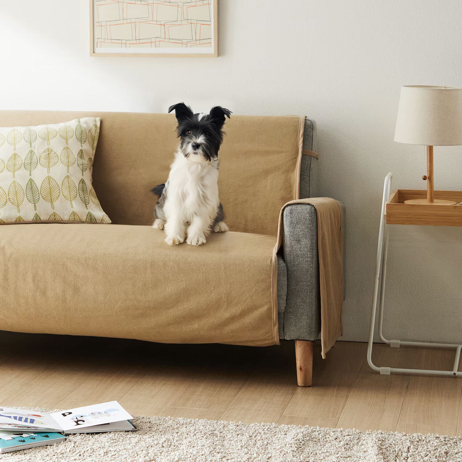 表面はふんわり綿パイル素材で寝心地快適裏面はラミネート加工を施しており水を通しにくい仕様に洗いにくいソファーを守るための1枚ワンちゃん、猫ちゃんのいるご家庭にぴったりお子様の食べこぼし、飲みこぼし対策にも使いやすいシンプルな無地カラーひもで固定できるから、ずれにくい