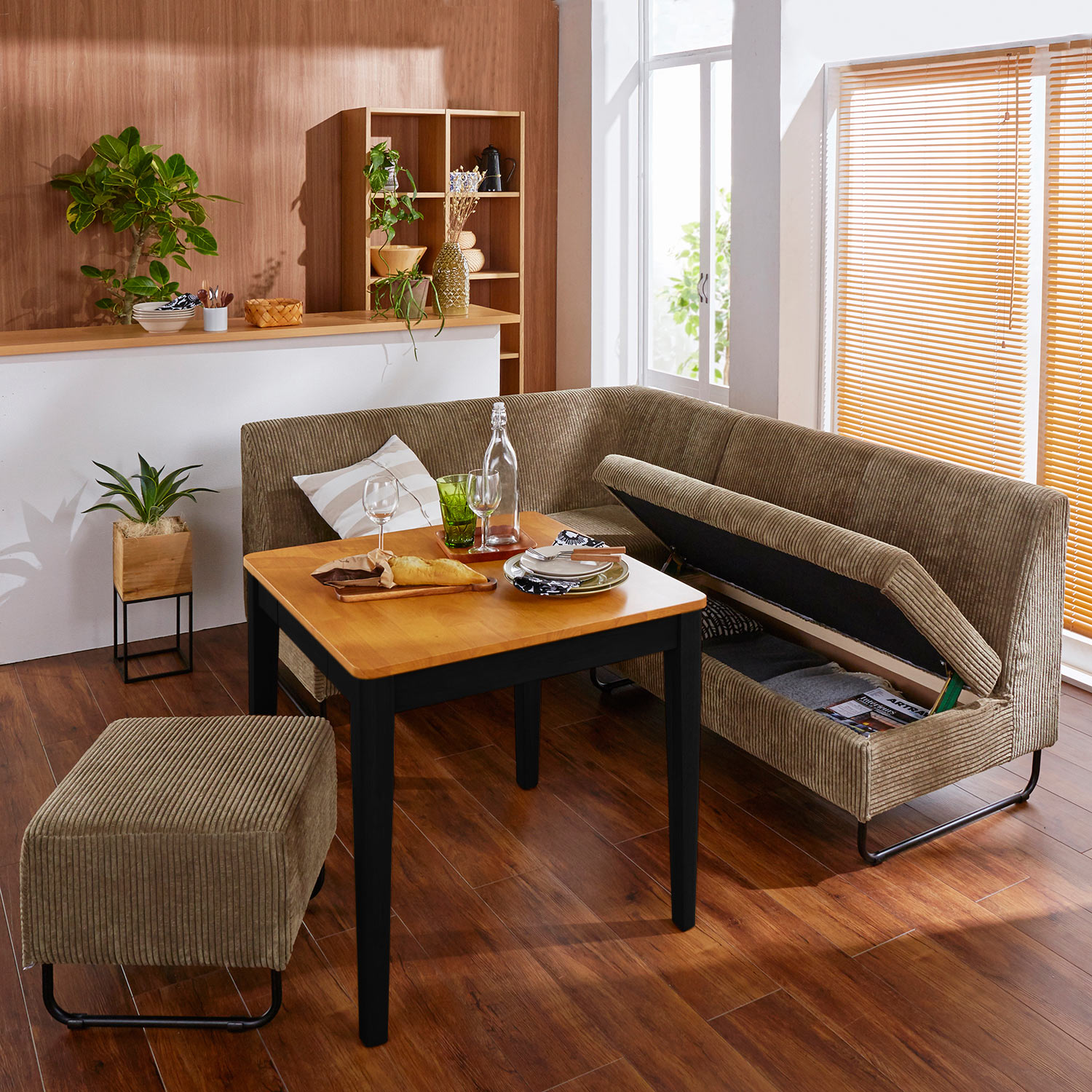 なめらかな手触りのコーデュロイ生地を採用インテリアの主役にもなるおしゃれなダイニングソファー硬めの座面は、食事シーンはもちろん寛ぎシーンも座り心地快適です座面下には収納を備え、リビングやダイニングまわりの小物を収納OK張地はカバーリング仕様で汚れたらドライクリーニング可能カバー下は合皮素材でそのまま使用できるからクリーニング中も安心ですどっしりとしたフォルムながらもスチール脚で印象すっきりレイアウトして楽しめる「スツール」「2人掛け」「肘付き(右)」「肘付き(左)」の4タイプ展開です座り心地背もたれ・座面ともにしっかりしたクッション性で、長時間座っても疲れにくい座り心地です