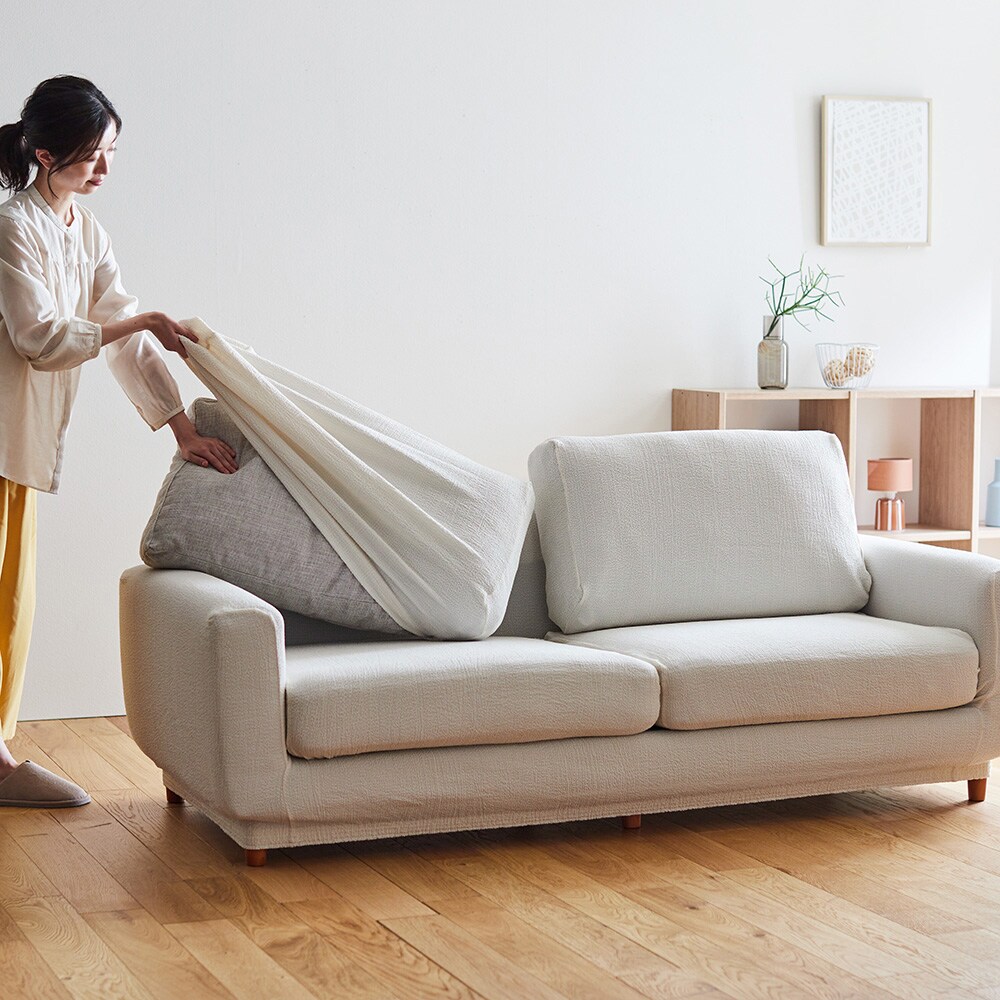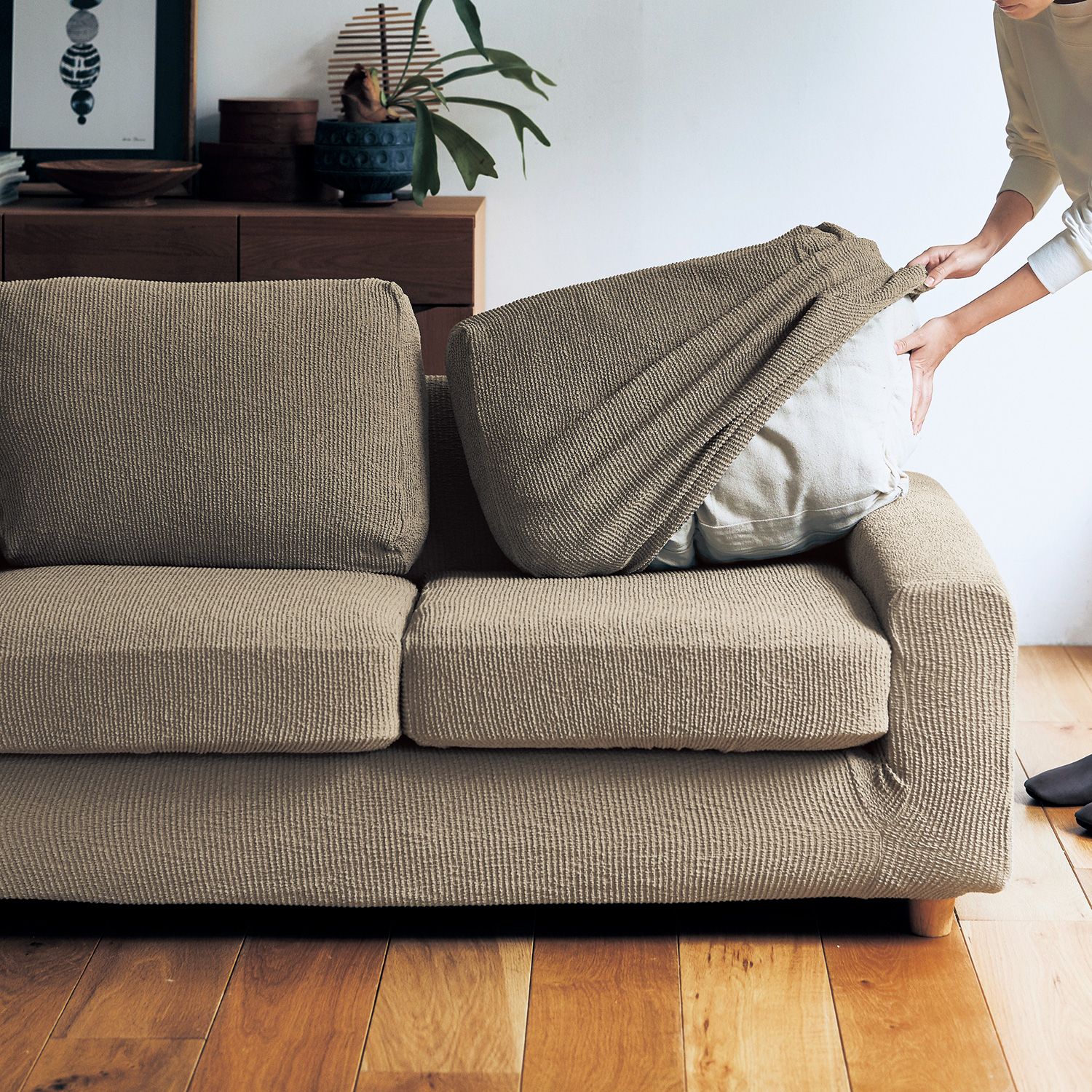 本体と背面・座面を分けたソファー用・分割タイプシャリッと心地いいリネン混素材を、ぽこぽこと凹凸のある編み地にした夏仕立てに肌にあたる面積が少ない分、汗ばんでいてもぺったりと貼りつかず、手ざわりもさらっとしていますタテヨコによく伸びて、パーツごとなのでひとりでも簡単に掛け替えられます汚れたパーツだけ洗濯できるのも便利水をこぼしてもさっと拭きとれてお手入れしやすい、撥水加工済み