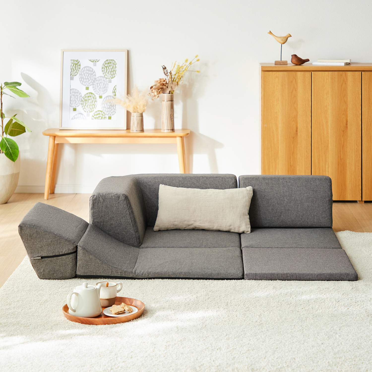 三つ折りマットレスに細長いクッションがくっついたようなユニークな形状折りたたみ方を変えることで、日常使いのソファーから脚をゆったり伸ばすカウチソファー、またベッドとしてなど何通りにも使えるリクライニングソファーベッドです背もたれ部は14段階に細かく調節OK細長いクッション部分はファスナーで簡単に付け外しでき、枕や腰クッション、オットマンなど様々な使い方に対応しますまたカバーリング仕様の張地はクリーニングでき、いつでも清潔に使えるのもうれしいポイントカラーは3色をご用意しました