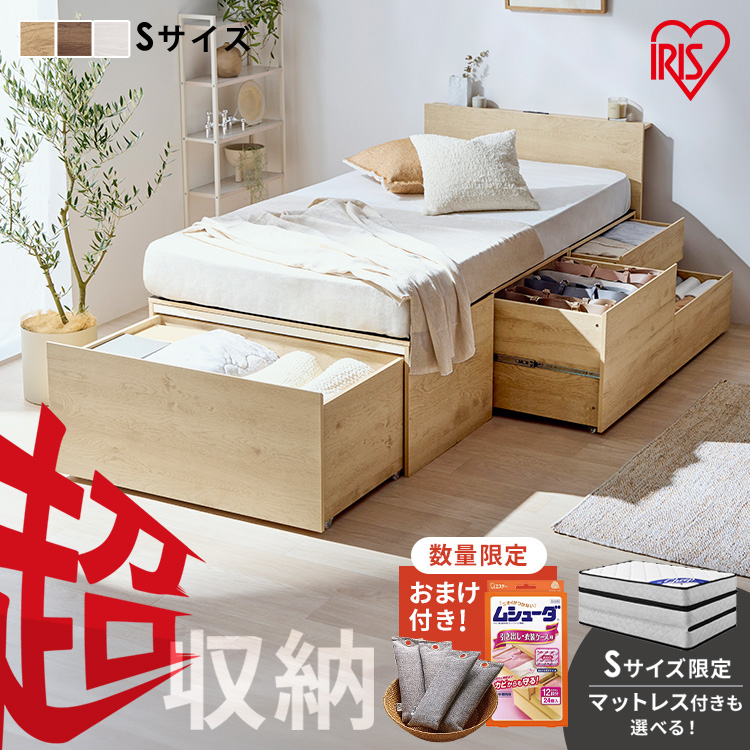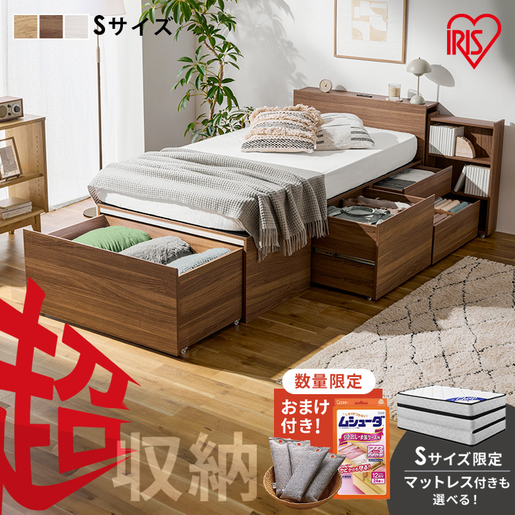 ■★クーポンあり★ ベッド シングル 収納 大容量 超収納 引出し 4個 棚 2口コンセント 滑り止め付 布団 洋服 家電 小物収納 ベッドフレー