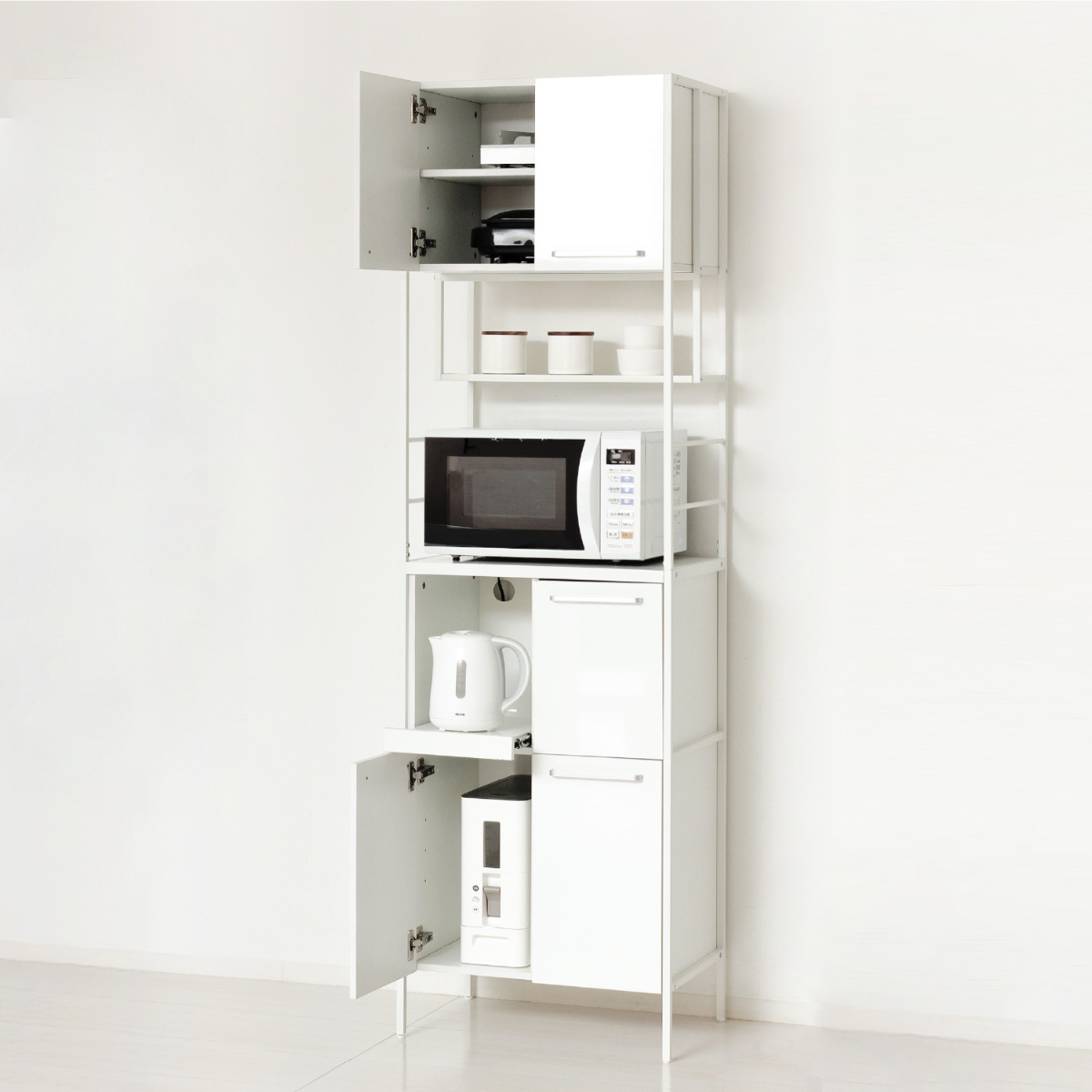 ■キッチンボード 幅60cm 2口コンセント付き マグネット スライド棚 可動棚 アジャスター付き ( キッチン 収納 家電 食器 コンセント付 ホ