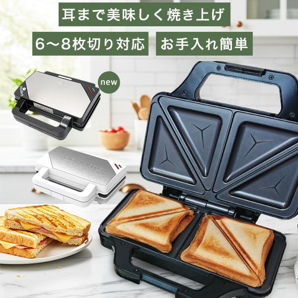 \ビッグホットサンドメーカーのここがポイント/ ■耳までまるごと贅沢サイズ 6〜8枚切り食パンの耳まで美味しく焼き上げ、具材もたっぷり入れられる大容量設計です。 ■効率的な二枚同時調理 一度に2個のホットサンドが作れる2枚プレートで、家族分をスピーディーに調理できます。 ■お手入れ簡単&安全設計 フッ素コート加工とサーモスタット機能で、使いやすさと安全性を両立しています。 ■スマート収納 縦置き可能な省スペース設計と、コード収納付きで使わない時もすっきり片付きます。 【食パンに具材をはさんで焼くだけ!忙しい朝でも、あっという間に朝食が完成しますね!】