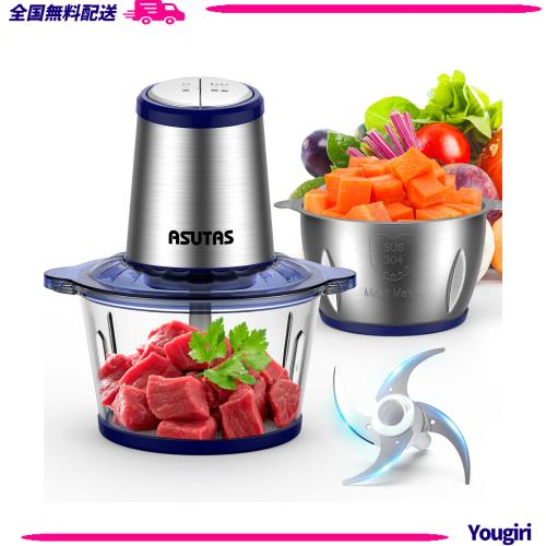 ■ASUTAS フードプロセッサー 2L大容量 【2ボウル】 1台5役 (刻む・混ぜる・潰す・砕く・粗おろし) 400Wハイパワー 2段階スピード 4枚刃カ
