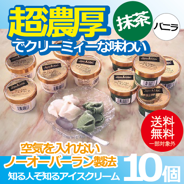 ※メーカー直送品のため下記の注意事項をご確認ください。 お支払方法は「商品代引き」不可 (お届けに7日程かかります) ギフト包装は不可。 のしは短冊のしなど簡易的なものとなります。 (名入れは不可となります) 沖縄 離島はお届けできません。【商品内容】バニラ、抹茶 各100ml×5個 合計10個【商品説明】通常アイスクリーム製造時にはアイスの原料に空気を混ぜ、冷たさを伝えにくく、ソフトな口当たりに仕上げます。知る人知るアイスクリームは従来の製造法とは一線を画したノーオーバーラン製法(空気を入れない製法)を用い、ねっとりとした重みのある味わいに仕上げました。市販のアイスには真似の出来ない超濃厚でクリーミィーな味わいのアイスクリームです。(濃厚過ぎて、とても固いため冷凍庫から出した後は電子レンジなどで多少温めると食べやすくなります。) 当店のオリジナルA.B.C熨斗(御中元・御歳暮等)をお選びいただいた場合は通常の熨斗での対応となります。 上記ご了承頂けますようお願い致します。