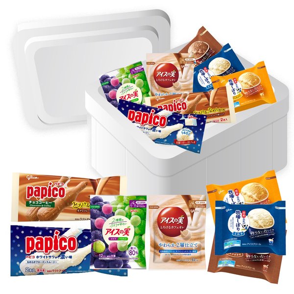 ※他店舗と在庫併用の為、品切れの場合は、ご容赦ください。商品仕様はメーカー都合などにより変更になる場合がございます。最新情報は個別にお問い合わせください。商品紹介 素材の味わい感じる、なめらかフローズンスムージーの「パピコ」2種と、大人も満足できるひとくちジェラート「アイスの実」2種、"しぼって3日以内"の国産の新鮮ミルク(=生乳)で作り上げたアイスクリーム「牧場しぼり」3種をそれぞれ2個ずつセットにしました。 親戚の集まりや子供のパーティー、ギフトなどにもご活用いただけます。 原材料・成分 パピコチョココーヒー乳製品(国内製造、外国製造)、砂糖、果糖ぶどう糖液糖、生チョコレート、水あめ、植物油脂、コーヒー/安定剤(増粘多糖類、ゼラチン、寒天)、乳化剤、香料、(一部に乳成分・ゼラチンを含む)パピコホワイトサワー乳製品(国内製造、シンガポール製造、ドイツ製造)、砂糖、果糖ぶどう糖液糖、植物油脂、水あめ/酸味料、香料、安定剤(増粘多糖類)、乳化剤、(一部に乳成分を含む)アイスの実ぶどうマスカット<ぶどう>ぶどう果汁・果肉、砂糖、果糖、植物油脂、水溶性食物繊維、水あめ/香料、安定剤(増