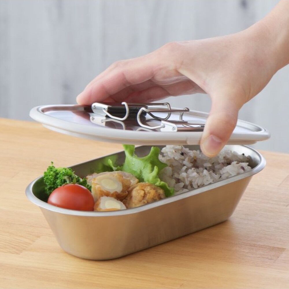 機能的で美しいデザインを目指した理由は、お使いいただくことがきっかけとなってフードロスや廃棄物の削減につながればという思いを込めました。お弁当、保存容器、作り置きなどにもおすすめ。底が細くなっており、手のひらにしっかり収まって持ちやすい形状です。丈夫で清潔なステンレス製。ゴムバンド付きのコンテナは蓋の上に物をのせることができるので冷蔵庫内のスタッキングに便利です。