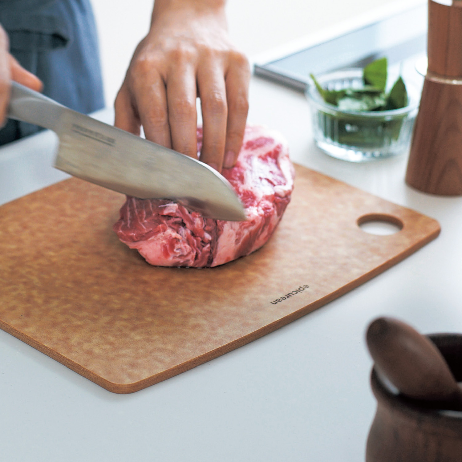 アメリカ・エピキュリアン社の機能的かつスタイリッシュなデザインのまな板社名でもある「epicurean」とは、美食を追求する人々の総称で、プロ仕様としても名高く、世界中で愛用されています天然木の繊維を合成した素材を使っています表面は非多孔性で穴や隙間がないため、水分や細菌の侵入を防ぎ、衛生面も安心水切れがよくてお手入れもカンタン耐熱温度が高く、食器洗浄機の使用もOKです薄型で軽いので扱いやすく、省スペースで収納穴に引っかけて吊るして収納もOK機能性だけでなく、スタイリッシュなデザインも魅力ナチュラルは食材との色馴染みが良く、ブラックは食材の色をはっきりと見せてくれますお料理を盛りつけるプレートとして使うとおしゃれな演出も楽しめます【多様なサイズ展開】■S:フルーツや切り忘れた食材のカットに良いサイズ■M・L:普段使いにおすすめのサイズ■LL:白菜やキャベツなどの大きくてボリュームのある食材をカットするのに良いサイズ