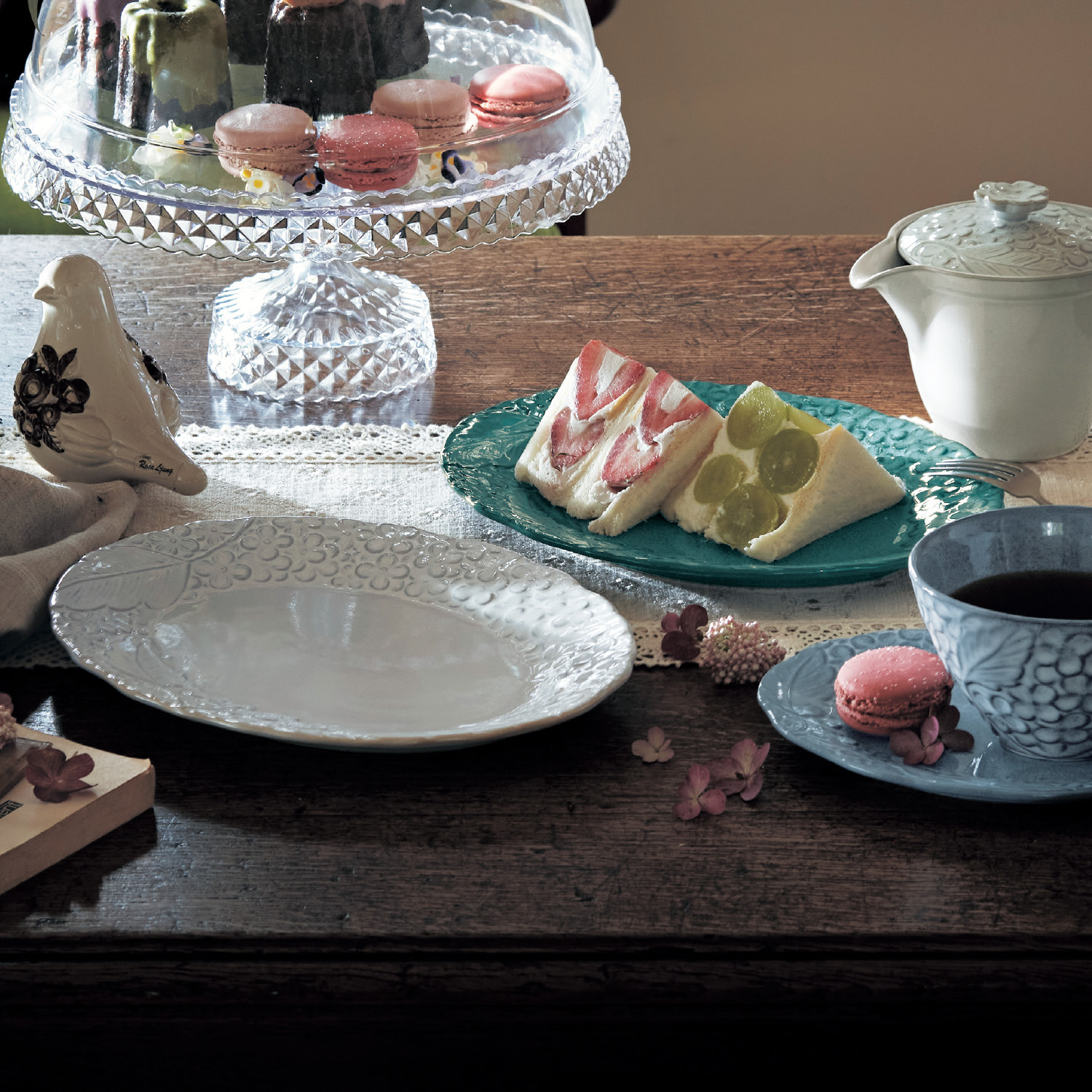 スイーツを並べるだけでおうちがカフェ風にサンドイッチなどの軽食を盛り付けても映えますハンバーグなどの洋風料理にもおすすめの程よいサイズ感です葉っぱや花のモチーフのレリーフが美しく、うっとりする美濃焼のプレート。器になかなかない色味も魅力的