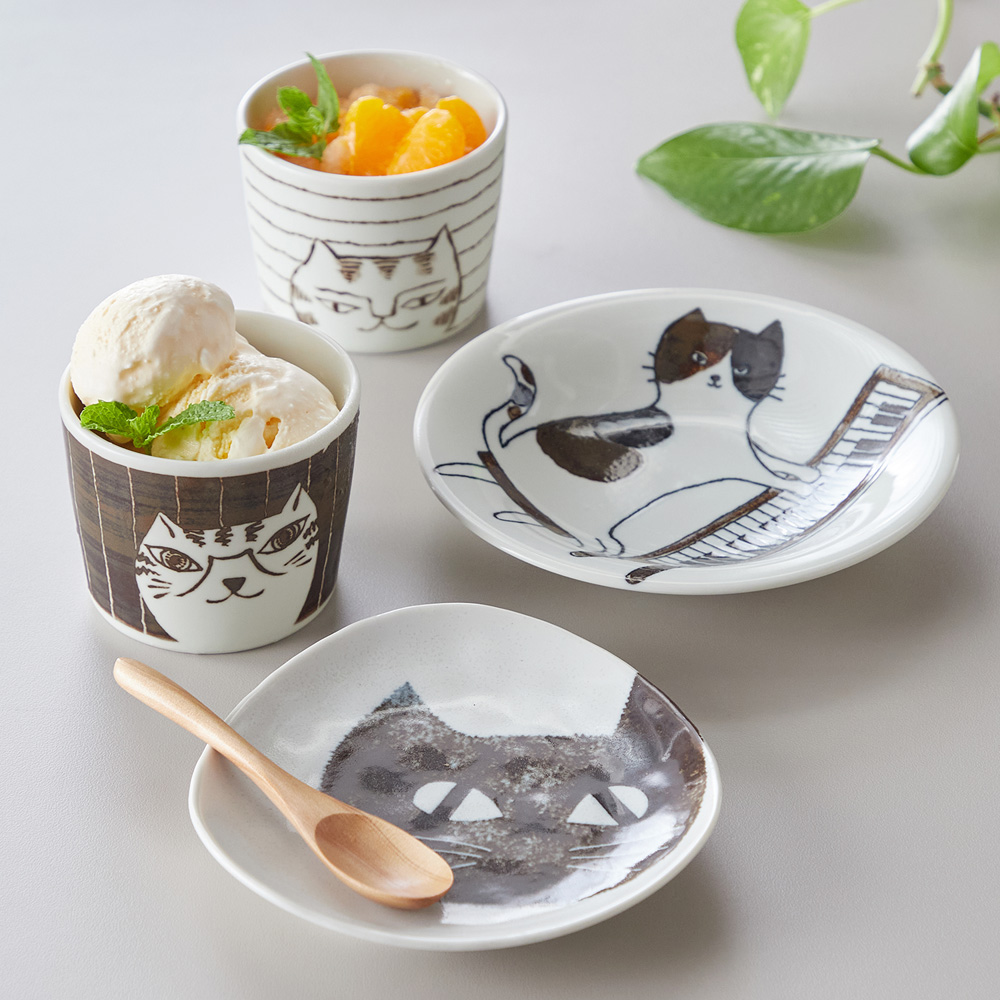 ■【ベルメゾン】美濃焼 ねこモチーフのそばちょこ & 小皿セット 【レンジ・食洗機対応】