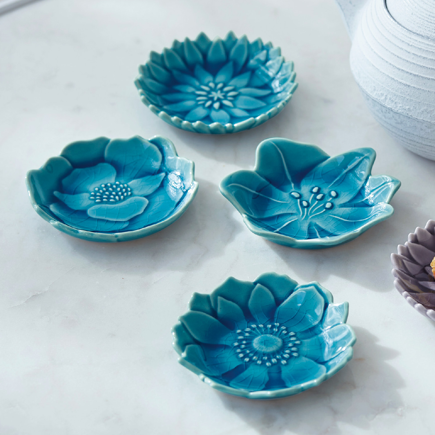 ボタン、アネモネ、アマリリス、ダリヤの4種類の花をかたどった小皿4種類の花を同色でセットにしてお届けします立体感と釉薬の味わいに凝った瀬戸焼調味料や薬味、小さなおやつを入れて食卓に置くとかわいいアクセントに。アクセサリー用にしたり、インテリア小物として使っても素敵です。