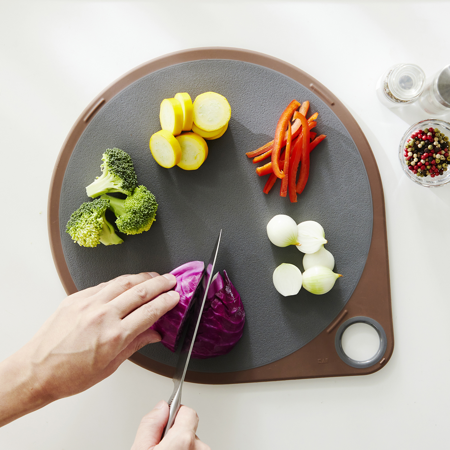 ナチュラルで清潔感のあるホワイト×ベージュとクールでスタイリッシュな印象のチャコールグレー×ブラウンの2色でラインナップひろい作業スペースが魅力の円形状のまな板奥行きがありひろく使用できるので複数の食材の下ごしらえも、まな板上で行うことができ、洗い物の軽減にも