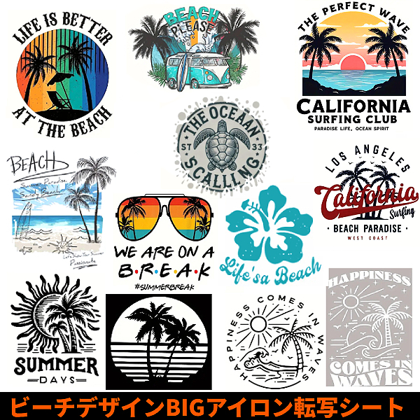 ■BIG ビーチ バケーション イラスト アイロン 接着 シート プリント シール ステッカー 熱転写 リメイク デザイン Tシャツ バッグ 大きめ