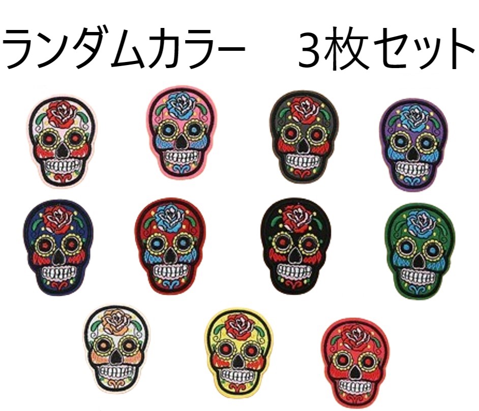 ■3枚セット ランダムカラー メキシコ メキシカン スカル シュガースカル カラベラ Calavera 刺しゅうワッペン アップリケ パッチ アイロン