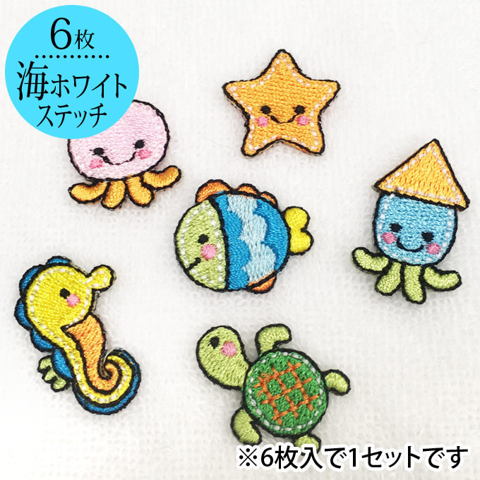 ■ワッペン ホワイトステッチ 海 魚 小 6枚セット アイロン 刺繍 マーク シンプル プレゼント 服 ワンポイント かわいい