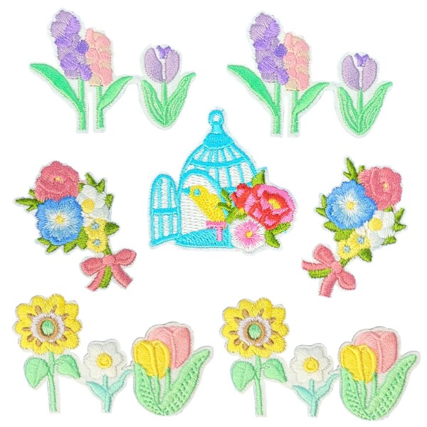 ■WATASHINO ワッペン 花 アイロン 女の子 刺繍 アップリケ 幼稚園 小学校 手芸 (花鳥かご 7枚セット)
