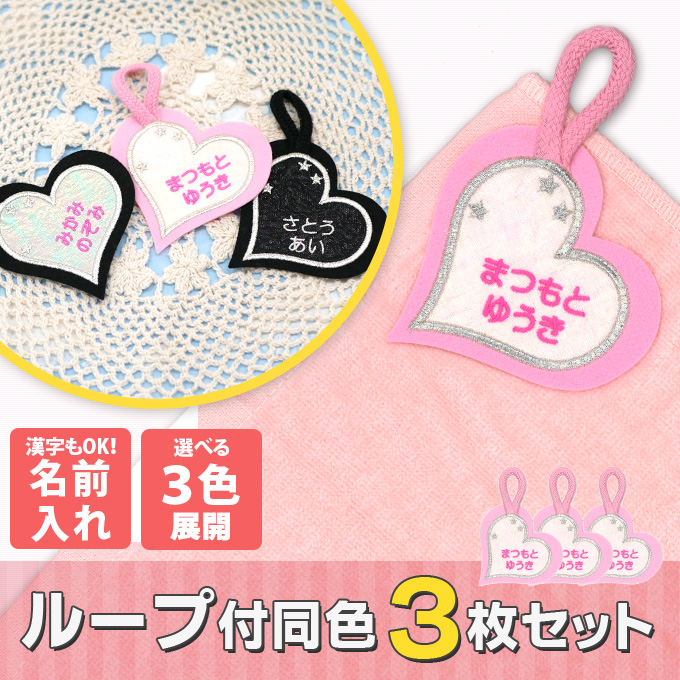 ■お名前ワッペン ループ タオル掛け ハート 3枚組 ネームワッペン アイロン 入園 刺繍 プレゼント OR
